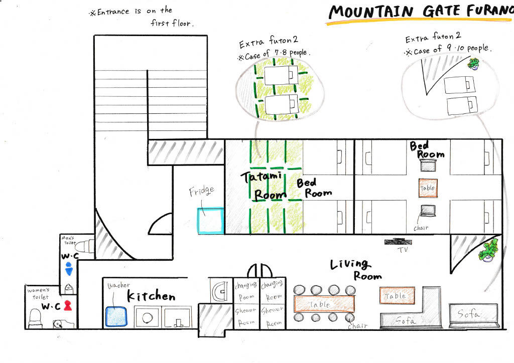 リビング※エキストラマットレス2つ、シャワー室2つ、トイレ2つ、寝室A(和洋室 2 ベッド※エキストラ敷布団2つ)、寝室B (洋室4 ベッド) キッチン(電磁調理)、洗面